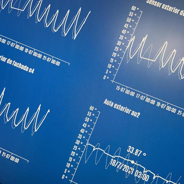 Este verano hemos comenzado a sensorizar los datos de temperatura y humedad en la fachada del jardín vertical y en el interior de las aulas asociadas.
